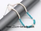 Details: Fashion pearl necklace: 5mm - 6mm potato white freshwater pearls & turquoise beaded necklace finished with copper lobster clasp Item: CFN105 Material: 5-6mm, 8-9mm & 10-11mm potato white freshwater pearls 6mm & 8mm round turquoise 1.5*4mm copper spacers Copper lobster clasp(#1) (you can choose different spacer & clasp, if you like sterling silver clasp or other clasp we don't show, please contact us before you placing order) Color: See image Style: No.1: Non-knotted (Default) No.2: Hand-knotted Length (inch): Approx 16 inch (Default, Include the clasp, but not including Tail Chain) You can choose 17”; 18”; 19”; 20”; 22” or 24”