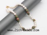 Details: Fashion pearl necklace: 16 - 24 inches 9mm - 10mm potato white freshwater pearls & unakite beaded necklace finished with copper spring ring clasp Item: CFN547 Material: 9-10mm potato white freshwater pearls 10mm & 12mm round unakite beads 2*5mm copper spacers (No.4) 11mm copper spring ring clasp (you can choose different spacer & clasp, if you like sterling silver clasp, other clasp or better quality potato white freshwater pearls we don't show, please contact us before you placing order) Color: See image Style: No.1: Non-knotted (Default) No.2: Hand-knotted Length (inch): Approx 16 inch (16-17”, Default) You can choose 17”(17-18”); 18”(18-19”); 19”(19-20”); 20”(20-21”); 22”(22-23”) or 24”(24-25”)