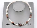 Details: Fashion pearl necklace: 16 - 24 inches 9mm - 10mm potato white freshwater pearls & picasso jasper beaded necklace finished with copper spring ring clasp Item: CFN560 Material: 9-10mm potato white freshwater pearls 10mm & 12mm round picasso jasper beads 2*5mm copper spacers (No.4) 11mm copper spring ring clasp (you can choose different spacer & clasp, if you like sterling silver clasp, other clasp or better quality potato white freshwater pearls we don't show, please contact us before you placing order) Color: See image Style: No.1: Non-knotted (Default) No.2: Hand-knotted Length (inch): Approx 16 inch (16-17”, Default) You can choose 17”(17-18”); 18”(18-19”); 19”(19-20”); 20”(20-21”); 22”(22-23”) or 24”(24-25”)