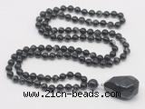 Details: Hand-knotted agate mala necklaces: 108 8mm/10mm round black banded agate beads with 1 12mm guru bead and black banded agate pendant (you can choose different pendants, but there will be tiny different in shape & color, we will make the jewelry randomly according to our stock) Item: GMN4841 Material: 8mm: 108 8mm black banded agate beads, 12mm guru bead & black banded agate pendant 10mm: 108 10mm black banded agate beads, 12mm guru bead & black banded agate pendant Color: See image Length (inch): Necklace length: 8mm: approx 37 - 40 inches (Not including guru bead & pendant) 10mm: approx 46 - 50 inches (Not including guru bead & pendant) Pendants: approx 18*35mm – 28*40mm Quantity Discount Pricing: 1 – 4: None 5 – 49: 95% 50 – 99: 90% 100+: 85% This mala is available in both 8mm and 10mm beads, The listed price is for 1 piece 8mm mala necklace