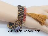 Details: Hand-knotted 7 Chakra mala necklaces: 108 8mm/10mm round grade A yellow tiger eye, 7 chakra beads with tassel (you can choose different tassel) Item: GMN6124 Material: No.1(8mm: yellow tiger eye, 7 chakra beads & tassel No.2(10mm: yellow tiger eye, 7 chakra beads & tassel Color: See image Length (inch): Necklace length: 8mm: approx 37 - 40 inches (Not including tassel) 10mm: approx 46 - 50 inches (Not including tassel) Tassel Lenght: 7cm Quantity Discount Pricing: 1 – 4: None 5 – 49: 95% 50 – 99: 90% 100+: 85% This mala is available in both 8mm and 10mm beads, The listed price is for 1 piece 8mm mala necklace
