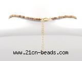 Details: Tiny beaded jewelry: 4mm faceted round tiny picture jasper beaded necklace with letter charm and finished with brass lobster clasp. Item: GMN7527 Material: 4mm faceted picture jasper beads, 14mm letter charm & 7*12mm lobster clasp (you can choose different style; clasp & letters A-Z charm) Color: See image Length (inch): approx 20 inches (Not including 2 inches extender chain) Quantity Discount Pricing: 1 – 4: None 5 – 49: 95% 50 – 99: 90% 100+: 85% The listed price is for 1 piece necklace